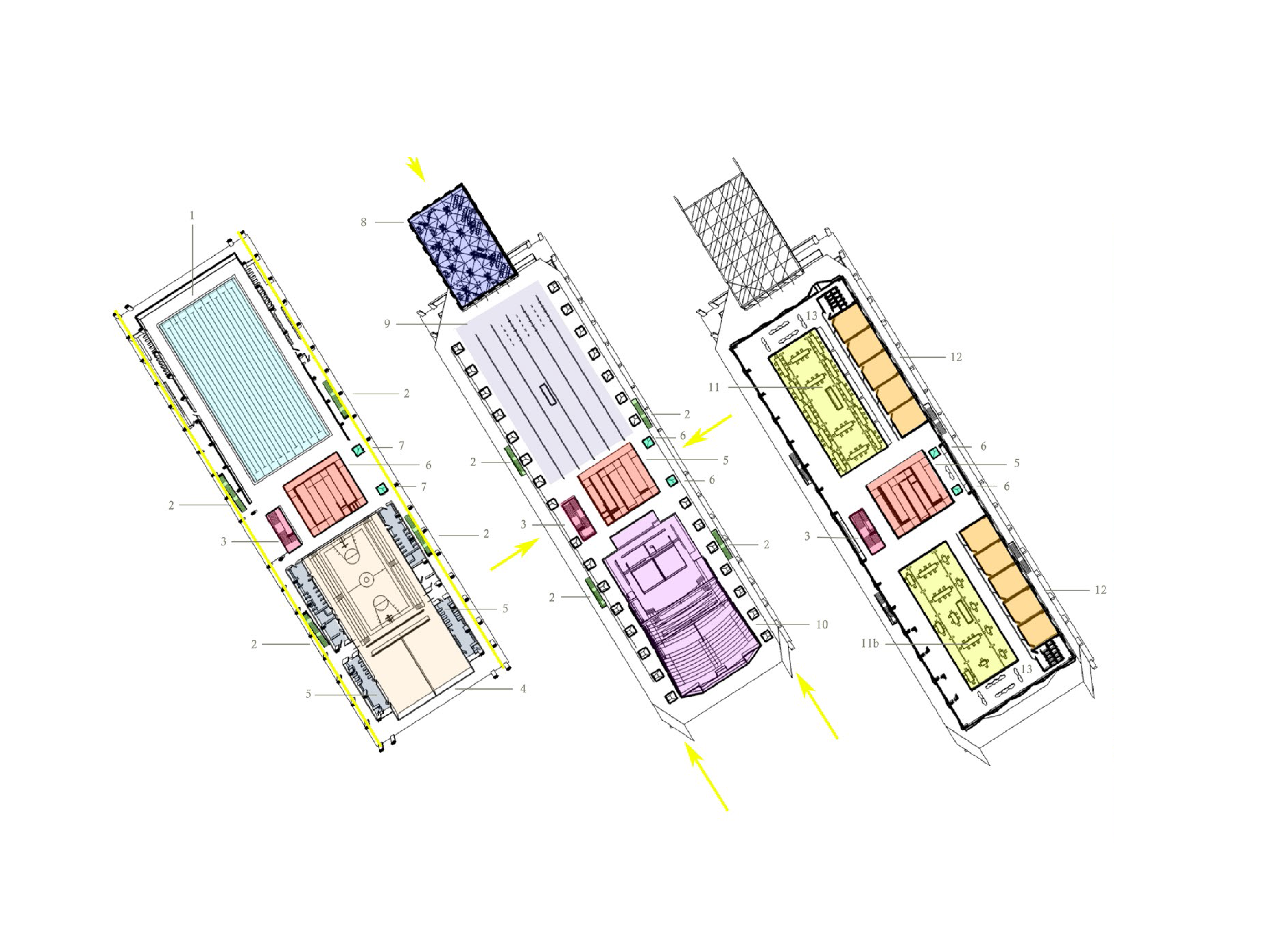 The New Building responds to a modular structure which is outspoken and confirmed in the external cladding. The construction scheme, which is developed in 19 Intervention Stages, mirrorize the number of prefab modules 7*28 meters large, in a height of 11.8, which give shape to the building. The scheme will be completed in 20 weeks beside the demolition and excavation period. This, about the method.